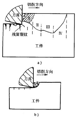 硬脆非金屬材料主要有工程陶瓷、玻璃及石材等。在使用金剛石刀具切削陶瓷時,可以觀察到被切削陶瓷在刀刃擠壓作用下,在刀刃附近產(chǎn)生裂紋,裂紋先向前下方擴展,深度超過切削深度,而后一邊前進(jìn)一邊向上方擴展,作后穿過工件上部的自由表面,此時形成較大的薄片狀切屑,并在切削表面上留下凹痕(見圖1-8a),這種情況稱之為大規(guī)模擠裂。如果從這種狀態(tài)下繼續(xù)切削,實際切除的只是崩碎后的殘留部分,這時發(fā)生小規(guī)模擠裂,生成切削表面上較平滑的部分(見圖1-8b)。另外,由于刀刃后方的材料內(nèi)存在拉應(yīng)力,所以在工件已加工表面上可能還會產(chǎn)生與表面大體相垂直的裂紋。在小規(guī)模擠裂發(fā)生以后,刀刃前方的材料就形成與切削表面近似垂直的形狀,切削深度再次變大,切削該部分材料時將再次發(fā)生大規(guī)模擠裂。大規(guī)模擠裂與小規(guī)模擠裂交替進(jìn)行,工件材料就這樣被逐步切開。