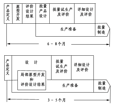 產(chǎn)品開發(fā)是一個從市場獲得需求信息,據(jù)此構(gòu)思產(chǎn)品開發(fā)方案,最終形成產(chǎn)品投放市場的過程。雖然在產(chǎn)品開發(fā)過程中并非所有步驟都可以平行進(jìn)行,但根據(jù)對產(chǎn)品開發(fā)過程的信息流分析,可以通過一些工作步聚的平行交叉,大大縮短產(chǎn)品開發(fā)時間。例如:日本NEC公司將某種產(chǎn)品原本歷時6--8個月的開發(fā)過程,通過并行重組縮短為3個半月,如圖1。