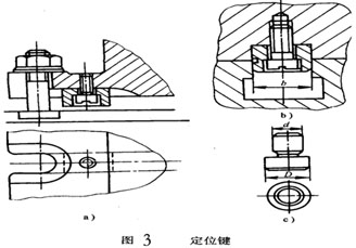 定位鍵有矩形和圓形兩種,圓形定位鍵(如圖4C所示)補償貿(mào)易加工,便較易磨損,故用得不多。矩形定位鍵有兩種結(jié)構(gòu)形式,一種在鍵的側(cè)面開有溝槽或臺附(圖4b),把鍵分為上、下兩部分,其上部按H7/h6與夾具體底面上的槽或臺附。下部與多才多藝床工作臺上的T形槽配合。因工作臺T形槽的公差為H8或H7,故尺寸b按h8或h6制造,以減少配合間隙,提高定向精度。另一種鍵為矩形(圖4)上下兩部分尺寸相同,它適用于定向烳工度要求不高的夾具。