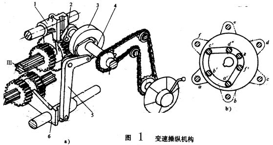 軸Ⅱ上雙聯(lián)齒輪和軸Ⅲ上的三聯(lián)齒輪是用一個(gè)手柄同時(shí)操縱的。變速手柄裝在主軸箱的前壁面,手柄通過(guò)鏈傳動(dòng)使國(guó)4轉(zhuǎn)動(dòng),在軸4上固定有盤形凸輪3和曲柄2.凸輪3上有一條封閉的曲線槽,它由兩段同半徑的圓弧和直線所組成。凸輪上有6個(gè)不同的變速置,(如圖中以a-f標(biāo)出的位置)。凸輪曲線槽通過(guò)杠桿5操縱軸Ⅱ上的雙聯(lián)滑動(dòng)齒輪。當(dāng)杠桿的滾子心處于凸輪曲線槽的大半徑處時(shí),皮時(shí)齒輪在左端位置;若處于小半徑處時(shí),則移到右端位置。 曲柄2上的圓銷的伸出端套有滾子,嵌在拔叉1的長(zhǎng)槽中。當(dāng)機(jī)柄2隨著軸4轉(zhuǎn)動(dòng)時(shí),可帶動(dòng)撥動(dòng)軸Ⅲ的滑動(dòng)齒輪,使它處于左、中、右三種不同的位置。順次地轉(zhuǎn)動(dòng)手柄至各個(gè)變速位置,就可使兩個(gè)滑動(dòng)齒輪塊的軸向位置實(shí)現(xiàn)6種不同的組合,從面使軸Ⅲ得到6種不同的轉(zhuǎn)速;讫X輪聲色移至規(guī)定的位置后,采用鋼球定位裝置進(jìn)行了可靠的定位。