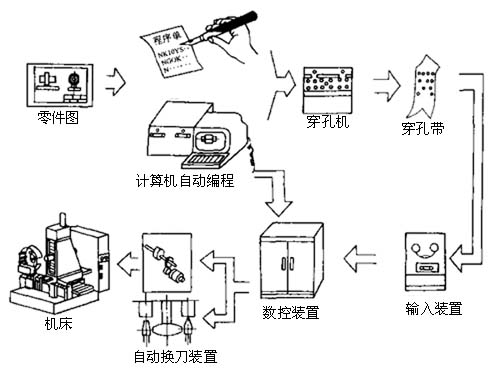 (2) 數(shù)控機床的工作原理。數(shù)控機床和加工中心的工作原理見圖7-2,根據(jù)零件圖樣,制訂工藝方案,編制零件的加工程序,把零件所需的機床各種動作及全部工藝參數(shù)變成機床數(shù)控裝置能接受的信息代碼。并把這些代碼存儲在信息載已上(穿孔帶、磁盤等),將信息載體送到輸入裝置,讀出信息并送入數(shù)控裝置。另一種方法是利用計算機和加工中心的接口直接進(jìn)行通信輸入。