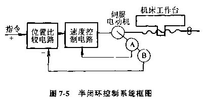3)半閉環(huán)控制數(shù)控機床,這種控制方式對工作臺的實際位置不進行檢查測量,而是通過與伺服電動機有聯(lián)系的測量元件,如測速發(fā)電機A和光電編碼盤B(或旋轉變壓器)等間接檢測出伺服電動機的轉角,推算出工作臺的實際位移梁,并與指令值進行比較,用差值來實現(xiàn)控制(圖7-5)。這種控制方式工作臺沒有完全包括在控制回路內,精度沒有閉環(huán)高,調試卻比閉環(huán)方便。