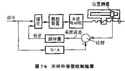 4)開換補償型數(shù)控機床,將上述三種控制方式的特點有選擇地集中起來,可以組成混合控制的方案。大型數(shù)控機床,需要高得多的進給速度和返回速度,又需要相當高的精度。如果只采用全封閉的控制,機床傳動鏈和工作臺全部置于控制環(huán)節(jié)中,安裝調試十分復雜,為了避免這些矛盾,可以采用混合控制方式。圖7-6為開環(huán)補償方式的組成框圖。它的特點是:基本控制選用步進電動機的開環(huán)控制伺服機構,附加一個校正伺服電路。通過裝在工作臺上的直線位移測量元件的反饋信號來校正機械系統(tǒng)的誤差