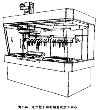 1) 十字工作臺型(圖7-25)布局與單柱立式坐標(biāo)鏜床或十字工作臺型數(shù)控立式鉆床類似,適應(yīng)于高度尺寸較小的蓋板類零件多工序加工。