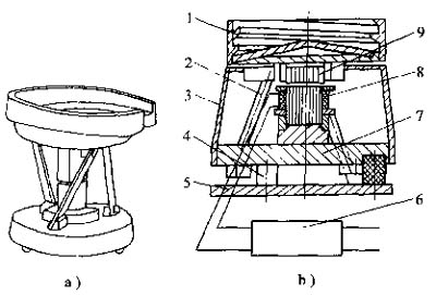 (1) 振動式料斗的運(yùn)動特點圖60-1的振動式料斗由電磁力作為驅(qū)動力。當(dāng)電磁達(dá)到最大值時,街鐵9被吸下,帶動料斗1,同時三片沿圓周方向分布的彈簧2變形。電磁力消失時街鐵放開,彈簧復(fù)原。彈簧的變形,復(fù)原過程中,料斗1既作上下運(yùn)動,又作扭轉(zhuǎn)運(yùn)動,使零件從低部沿螺旋軌道上升,在料斗內(nèi)座上布置的定向裝置對零件作定向整理。正確定向的零件從料斗上部的出料口進(jìn)入輸聊管道。