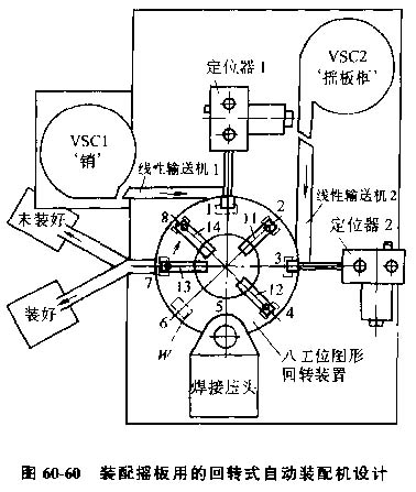 (1)搖板自動裝配機(jī),圖60-59所示的搖板由搖板框及銷組成,用電阻焊聯(lián)接。