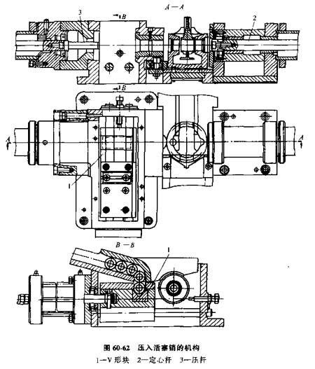 壓入活塞機(jī)構(gòu);在活塞被送到與連桿、活塞銷裝配的工位后,活塞銷也被送到位,然后將活塞銷壓入。見(jiàn)圖60-62;钊N的送進(jìn)用專用裝置實(shí)現(xiàn),利用直角V形塊1夾住活塞銷,并使銷沿導(dǎo)軌移到其軸線與定心桿2和壓桿3的軸線重合的位置。在壓入活塞銷前;钊c連桿一起用定心桿2同時(shí)定向;壓入活塞銷后,定心桿2被壓桿3擠出來(lái),在工位1上裝配好的一套連桿活塞被提升上去,再由步距桿式運(yùn)輸器用擺桿運(yùn)向下一個(gè)裝配區(qū)。