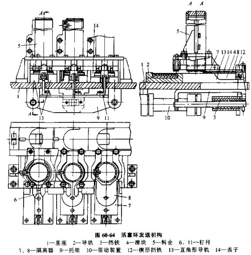 向滑塊上自動(dòng)發(fā)送活塞環(huán)的機(jī)構(gòu),圖60-64機(jī)構(gòu)有一個(gè)基座上緊固著逐個(gè)發(fā)送活塞環(huán)的料倉5和杠桿6,在垂直于料倉中心線的平面內(nèi)鉸接并用彈簧相互拉緊,還帶有形狀與被夾持的活塞環(huán)相似的輥?zhàn)鱼Q口,以及在料倉下垂直其中心線的并在平面內(nèi)能移動(dòng)的隔離器7和8推板做成托架9的形式,并帶有強(qiáng)制性驅(qū)動(dòng)裝置10,推板沿導(dǎo)軌2移動(dòng),用杠桿11與滑塊4相互作用,滑塊上固定隔離器7和8以及楔形擋鐵12,在滑塊工作行程末端與彈簧杠桿6相互作用。滑塊連同不動(dòng)的固定隔離器可以在固定于基座上的直角形導(dǎo)軌13內(nèi)移動(dòng)。隔離器上面用蓋子14蓋住,靜止地架在直角形導(dǎo)軌13上面