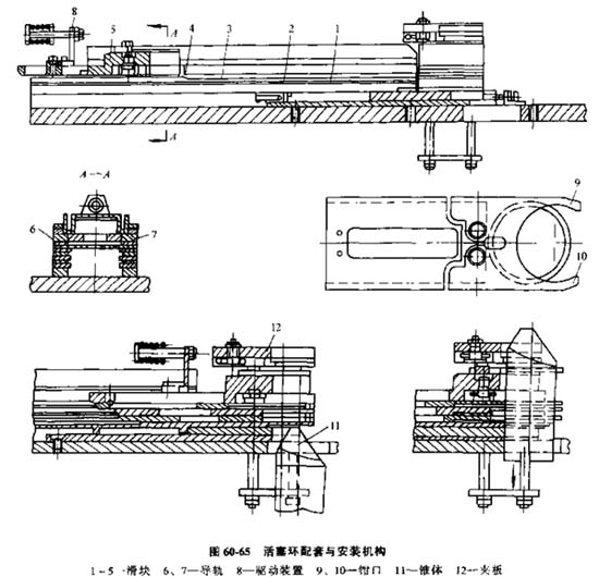 A. 在活塞槽中安裝活塞環(huán)的機構(gòu),圖60-65機構(gòu)做成盒子形狀,盒子的壁由滑塊1、2、3、4、5形成,每一個滑塊帶一套活塞環(huán)中、的一個。滑塊依次安排在導(dǎo)軌6和7上。導(dǎo)軌具有斜角,可將活塞環(huán)壓在安裝基準(zhǔn)中,在起始位置上,這個些滑塊的端部構(gòu)成了一個朝向工作區(qū)的臺階,除最底下的一個滑塊外,每一個滑塊都有一塊擋鐵,作為推桿來推動其下面的滑塊;上面的滑塊4與往復(fù)運動驅(qū)動裝置8相連。滑塊的端部作成兩鉗口9和10,相互之間為彈性聯(lián)系。在導(dǎo)軌6和7上,滑塊按活塞環(huán)的給定高度配置。從專用的盒狀料倉中通過導(dǎo)軌的縫隙拉出活塞環(huán)。當(dāng)滑塊5運動時,由于位于滑塊4槽上的擋鐵帶動滑塊4,類似地使滑塊3等移動。每一滑塊確定的間隙在自己的導(dǎo)軌上移動。接著又沿導(dǎo)軌的斜面移動,滑塊一個個地堆積起來。此時,每個活塞環(huán)以自己的大部分端面支撐在踝塊張開的爪上,并被上面滑塊壓住。