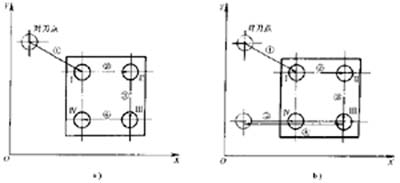 對(duì)于孔的位置精度要求高的零件,在精鏜孔系時(shí),安排鏜孔路線一定要注意做到各孔的定位方向一致,避免反向間隙的影響。例如圖4-4a所示的進(jìn)給路線,在加工孔Ⅳ時(shí),X的反向間隙將影響Ⅲ-Ⅳ孔的孔距精度。若按圖b的進(jìn)給路線,可使各孔的定位方向一致,故可提高孔距精度。