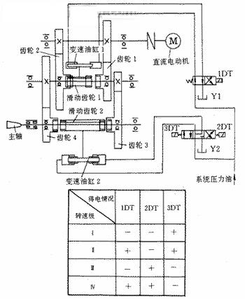 HC212ДФ1鏜銑床(主軸直徑220mm)是馬鋼機(jī)制公司90年代從俄羅斯進(jìn)口的大型機(jī)床。該機(jī)床主軸調(diào)速是通過主軸箱內(nèi)一套變速機(jī)構(gòu)和直流調(diào)速電動(dòng)機(jī)共同完成的。機(jī)械變速通過液壓系統(tǒng)來控制,使主軸獲得Ⅰ、Ⅱ、Ⅲ、Ⅳ4級(jí)轉(zhuǎn)速。其控制原理如圖1所示,電磁換向閥Y1和Y2分別控制變速油缸1和2,帶動(dòng)撥叉使滑動(dòng)齒輪1和2處于不同的工作位置,使主軸得到不同的轉(zhuǎn)速。其中變速油缸1有兩個(gè)工作位置,油缸2有3個(gè)工作位置。