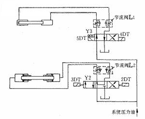 為解決問題,液壓系統(tǒng)從兩方面著手:①換向閥Y1重新選型;②在系統(tǒng)中增加速度調(diào)節(jié)環(huán)節(jié)。改造后的原理圖如圖2所示。選用國產(chǎn)24WE6D50/CFG24型電磁換向閥Y3替換Y1。閥Y3帶“記憶”功能,不因電磁鐵失電而改變閥芯位置。在Y3、Y2出油口處增加了節(jié)流閥組L1、L2,使變速油缸1、2獲得理想的運(yùn)動(dòng)速度。