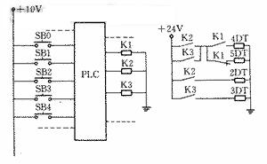 由于閥Y3帶有2個(gè)電磁鐵(4DT、5DT),且為“非”關(guān)系,如何從已占滿的PLC輸出端點(diǎn)中引出一控制信號(hào)來控制5DT呢(圖3)?若增加一輸出端點(diǎn)來控制5DT,勢(shì)必要增加輸出模塊,并要修改梯形圖,從而大大增加了改造費(fèi)用。為此我們對(duì)PLC輸出點(diǎn)進(jìn)行了一些改動(dòng)(圖4),圓滿地解決了PLC輸出點(diǎn)不足的問題。把PLC原來直接推動(dòng)電磁鐵改為推動(dòng)中間繼電器K1、K2、K3,然后由K1、K2、K3來控制電磁鐵4DT、5DT、2DT、3DT。通過K1的常開和常閉點(diǎn),使4DT和5DT滿足了“非”的關(guān)系。