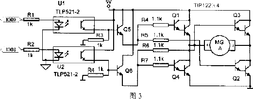 由于電機(jī)在正常工作時(shí)對(duì)電源的干擾很大,如果只用一組電源時(shí)會(huì)影響單片機(jī)的正常工作,所以我們選用雙電源供電。一組5V給單片機(jī)和控制電路供電,另外一組9V給電機(jī)供電。在控制部分和電機(jī)驅(qū)動(dòng)部分之間用光耦隔開(kāi),以免影響控制部分電源的品質(zhì),并在達(dá)林頓管的基極加三極管驅(qū)動(dòng),可以給達(dá)林頓管提供足夠大的基極電流。圖3所示為采用TIP122的驅(qū)動(dòng)電機(jī)電路,IOB8口為“0”,IOB9口輸入PWM波時(shí),電機(jī)正轉(zhuǎn),通過(guò)改變PWM的占空比可以調(diào)節(jié)電機(jī)的速度。而當(dāng)IOB9口為“0”,IOB8口輸入PWM 波時(shí),電機(jī)反轉(zhuǎn),同樣通過(guò)改變PWM的占空比來(lái)調(diào)節(jié)電機(jī)的速度。