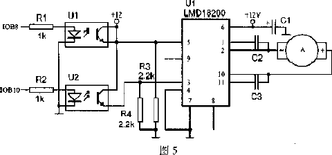 LMD18200是美國(guó)國(guó)家半導(dǎo)體公司推出的專用于直流電動(dòng)機(jī)驅(qū)動(dòng)的H橋組件,同一芯片上集成有CMOS控制電路和DMOS功率器件。此種芯片瞬間驅(qū)動(dòng)電流可達(dá)6A,正常工作電流可達(dá)3A,具有很強(qiáng)的驅(qū)動(dòng)能力,無(wú)“shot-through”電流,而且此種芯片內(nèi)部還具有過(guò)流保護(hù)的測(cè)量電路,只需要在 LMD18200的8腳輸出端測(cè)出電壓和給定的電壓比較即可保護(hù)電路過(guò)流,從而實(shí)現(xiàn)電路的過(guò)流保護(hù)功能。由LMD18200組成的電機(jī)驅(qū)動(dòng)電路如圖5所示。LMD18200的5腳為PWM 波輸入端,通過(guò)改變PWM的占空比就可調(diào)節(jié)電機(jī)的速度,改變3腳的高低電平即可控制電機(jī)的正反轉(zhuǎn)。此電路和以上幾種驅(qū)動(dòng)電路比較具有明顯的優(yōu)點(diǎn),驅(qū)動(dòng)功率大,穩(wěn)定性好,實(shí)現(xiàn)方便,安全可靠。