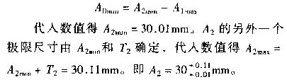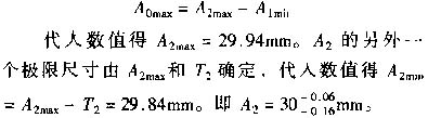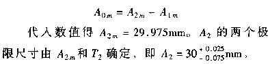當(dāng)以M為修配面時(shí),修配后A2變小,從而Ao也變小,對于一個(gè)偏大的A2值,可以通過修配使之變小。但A2過大則修配量大。由于一個(gè)偏小的A2值,無法通過修配M面來保證修配精度。因此,為了保證足夠的但又是最小的修配量,對修配使封閉環(huán)變小的場合,應(yīng)該令修配前、后環(huán)的最小尺寸相等,并由此解出修配環(huán)的一個(gè)極限尺寸: