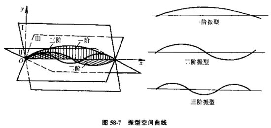 (1)撓性轉(zhuǎn)子動(dòng)平衡原理,將撓性轉(zhuǎn)子簡(jiǎn)化為一根簡(jiǎn)支梁,梁在其彈性穩(wěn)定平衡位置附近會(huì)發(fā)生多種形式的微小振動(dòng),其中橫向振動(dòng)是撓性轉(zhuǎn)子動(dòng)平衡的理論基礎(chǔ),整個(gè)轉(zhuǎn)子的振動(dòng)位移,即動(dòng)撓度曲線上一條繞如圖58-7所示的轉(zhuǎn)軸Oz,以角速度w回轉(zhuǎn)的空間曲線,可以視該曲線為無限多條固有頻率不同的振型曲線在空間疊加而成。各階振型曲線所在平面互不重合,圖58-7所示為三個(gè)振型的空間曲線。