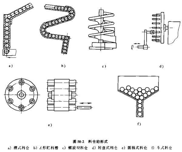 表50-1列出了典型的料斗形式,適用工件以及技術(shù)特性,供選擇定向方法和確定料斗機(jī)構(gòu)時(shí)參考。