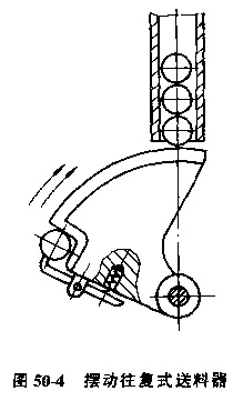 b.?dāng)[動(dòng)式送料器,圖50-4是帶動(dòng)式送料器,其搖臂上面為工件止動(dòng)面,兼有隔料作用。擺臂運(yùn)動(dòng)可由氣壓、液壓、機(jī)械傳動(dòng)。擺動(dòng)式送料器結(jié)構(gòu)比直線簡(jiǎn)單,不需較長(zhǎng)的滑動(dòng)導(dǎo)軌,節(jié)省空間,送料速度快。