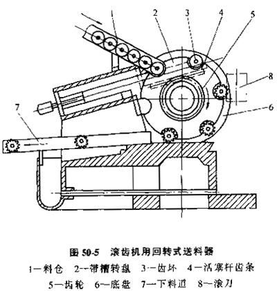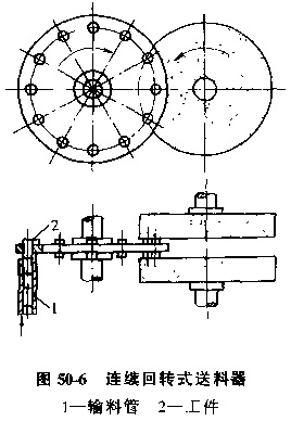A.回轉(zhuǎn)式送料器,圖50-5是滾齒機(jī)上用的回轉(zhuǎn)式送料器,當(dāng)帶狗槽的轉(zhuǎn)盤(pán)旋轉(zhuǎn)時(shí),槽口順次經(jīng)過(guò)料倉(cāng)的靠口處,單個(gè)工件落入槽口。轉(zhuǎn)盤(pán)外圓柱面為工件止動(dòng)面兼隔料作用。隨著轉(zhuǎn)盤(pán)的間歇轉(zhuǎn)動(dòng),坯料被送到加工工位,加工完的工件被送至下料道。