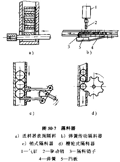50-7a為利用直線往復(fù)式送料器的表面隔料。圖50-7b是利用氣缸和彈簧傳動(dòng)的隔料器,隔料銷(xiāo)子在彈簧4作用下插入料槽,擋住工件,當(dāng)氣缸1驅(qū)動(dòng)銷(xiāo)2插入料槽將第二個(gè)件隔位時(shí),其前端頂在擋板5上,使銷(xiāo)子退出料槽,將第一個(gè)工件放行。圖50-7c為機(jī)械傳動(dòng)的銷(xiāo)式隔料器,圖50-7d為槽輪式隔料器。