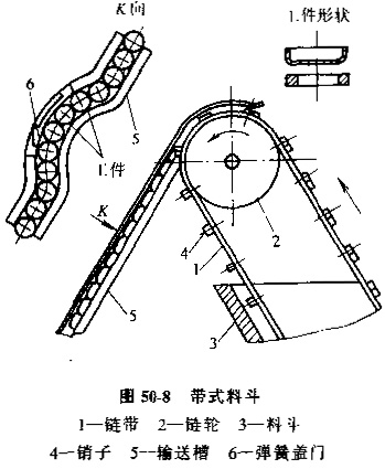 抓取法定向利用運(yùn)動(dòng)的定向機(jī)構(gòu)抓取工件的某些表面,。如孔、凹槽等,使之從成堆的雜亂工件中分離出來(lái),并定向排列。圖50-8所示的帶式料斗,適用于碗狀、蓋狀和環(huán)狀零件的自動(dòng)定向。裝有銷(xiāo)4的鏈帶1在連續(xù)運(yùn)動(dòng)時(shí),堆在料斗3中的工件被銷(xiāo)子4掛住,依次送入輸送槽5,當(dāng)槽5中料滿(mǎn)時(shí),銷(xiāo)子1仍帶工件擠入槽5,槽上彎曲部分的彈簧蓋門(mén)6被打開(kāi),多余的工件落入外料箱。