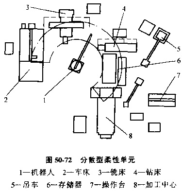 固定式機器人可分成服務于多臺機床式和服務于固定機床式兩種。圖50-72所示是采用一臺機器人把工件供給數臺機床的示例,著種柔性制造單元是以機器人為核心的系統(tǒng)結構。各臺機床的工件裝卸位置分布在機器人的可活動范圍內,機器人按控制成粗實現各臺機床的工件裝卸及傳遞。