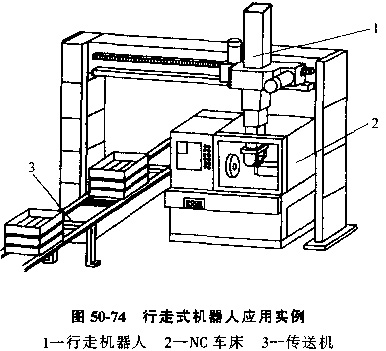 行走式機器人即移動式機器人,普通自動裝卸機處理工件功能的柔性較小,但隨著對這些功能柔性要求的提高,將自動裝卸機處理工件的功能轉變?yōu)闄C器人的臂和手的形態(tài),就形成了行走式機器人。圖50-74是行走式機器人的例子。采用了機器人與傳送機及運輸小車的組合輸送方式。