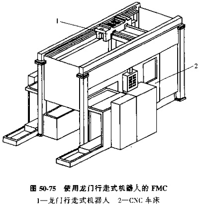 如果將單軌改為兩條導軌,則成為橋式起重機,或龍門式起重機,在柔性制造系統(tǒng)中也使用以這些起重機為基礎的行走式機器人,圖50-75所示的是德國柏林工業(yè)大學使用龍門行走式機器人的柔性制造單元,它的手部位可自動交換,不僅對工件,而且對刀具、量規(guī)和夾具進行搬運與操作處理。這種龍門行走式機器人結構堅固,可實現高精度定位。