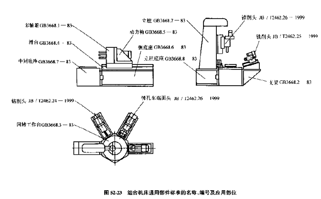組合機(jī)床通用部件的國(guó)家及部頒標(biāo)準(zhǔn),規(guī)定了名義尺寸,參數(shù)及互換尺寸,使同一類(lèi)型相同規(guī)格的通用部件可互換安裝,標(biāo)準(zhǔn)的名稱(chēng)編號(hào)及應(yīng)用部件見(jiàn)圖52-23。