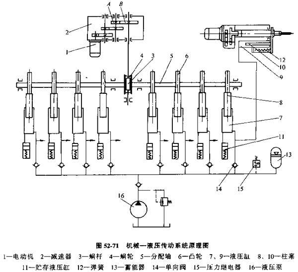 采用交流液壓傳動(dòng)控制的一個(gè)小型自動(dòng)線的工作原理見(jiàn)圖52-71。