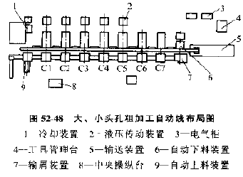毛坯上線后,先加工出定位面與兩個定位銷孔。在精加工前對定位銷孔再進行一次修整,以保證精加工工序精度。對工件幾個重要部位采用以下加工方法,對導(dǎo)管孔采用鉆、擴、鏜、鉸四道工序,對裝噴油嘴的孔應(yīng)采用劃定心孔,鉆大孔、劃球窩、鉆小孔、復(fù)合擴、復(fù)合鉸等工序。為滿足生產(chǎn)率要求和保證孔的直線度,挺桿孔采用槍鉆、槍鉸。自動線的工序安排見表52-19。由于自動線節(jié)拍時間長,一些鉆鉸工位上采用了工位轉(zhuǎn)塔動力頭以縮短自動線長度。