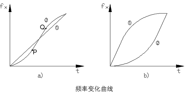 如a中的②圖所示,在頻率輸出過程中,頻率與時間的關(guān)系呈“S”形,即:在剛起動時,頻率的變化比較慢(0-P段),然后頻率又和時間成線性變化,在Q點以后,頻率的變化又降了下來。此種方式適合于帶式輸送機(jī)一類的負(fù)載。