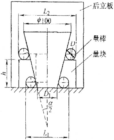 。1)將被檢圓錐軸小端朝下立在平臺(tái)上,用兩個(gè)直徑D=40mm的量棒放在平臺(tái)上且內(nèi)側(cè)與被測圓錐軸緊貼,后端面與后立板緊貼,用千分尺測得長度L1=151.20mm。