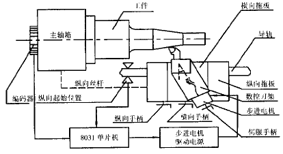 作為主運動的縱向自動走刀與原機床的縱向運動完全一樣,由主軸通過掛輪、走刀箱、縱向絲桿、開合螺母帶動工作臺作縱向運動。通過安裝在主軸上的用于拾取主軸信號的編碼器將主軸旋轉(zhuǎn)信號經(jīng)變換后,送入單片機。同時,將安裝在床身導軌上的霍爾元件所檢測的縱向起始信號也一并送入單片機中。根據(jù)零件輪廓形狀編制的加工程序通過鍵盤事先輸入到單片機中。經(jīng)微處理器處理后,按照加工工件輪廓形狀,發(fā)出一系列脈沖,經(jīng)步進電機驅(qū)動電源進行功率放大后,驅(qū)動步進電機帶動數(shù)控刀架作與縱向自動走刀相適應(yīng)的斜向運動,形成所加工工件的輪廓形狀。
