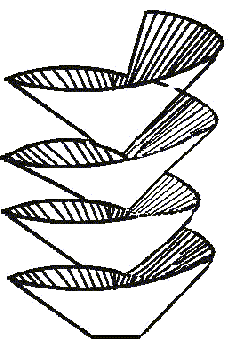 生成原理:麻花鉆刀刃各點(diǎn)切削速度不同。外刃處速度高,切屑流動(dòng)快,切屑較長(zhǎng)。越近中心速度越低,切屑排出越慢,切屑長(zhǎng)度越短。這種外刃卷成較大半徑的弧狀,近中心處卷成較小半徑的切屑,如不分?jǐn),就形成螺旋扇面形。這是麻花鉆直線刀刃最常見的切屑。