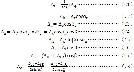 C2齒輪各項誤差應(yīng)按下述規(guī)定的方向計值:Δfpb、ΔFb、ΔFpX、Δffβ、ΔFw、ΔEwm、jn在齒面法線方向計值;ΔFi′、Δfi′、ΔFp、ΔFpk、Δfpt、ΔFβ、ΔFic′、Δfic′、jt在分度圓切線方向計值;Δff在基圓切線方向計值;ΔFr、ΔFi″、Δfi″、ΔEα″和ΔEH在雙側(cè)齒面徑向計值;ΔEs在雙側(cè)齒面分度圓螺旋線的法線方向計值。