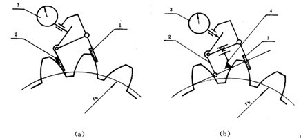 單點法測量法向側(cè)隙的原理參見圖45。單點測量法向側(cè)隙時:在中心距和使用時中心距相同的情況下,可用測片或塞片進(jìn)行測量。也可和測量圓周側(cè)隙相似使用百分表,但要將百分表測頭放置在與齒面垂直的方向上,此時從百分表上讀出的晃動量即為法向側(cè)隙值。
