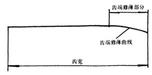 在加工過(guò)程中,對(duì)輪齒的一端或兩端,在一小段齒寬范圍內(nèi),將齒厚向齒端方向逐漸削薄,稱為齒端修薄。