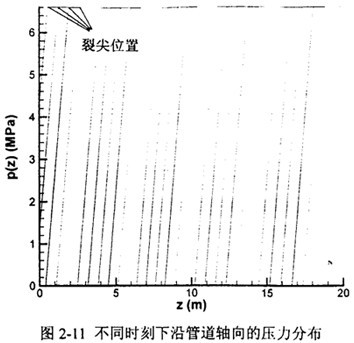 圖2-11直觀地給出了內(nèi)壓10MPa,裂紋速度216m/s時(shí)一維管道氣體壓力模型(L=1.5D)下的管壁壓力沿軸向的分布。每條曲線(xiàn)的衰減起始點(diǎn)即為該時(shí)刻的裂尖位置。圖中裂尖壓力約為6.6MPa。