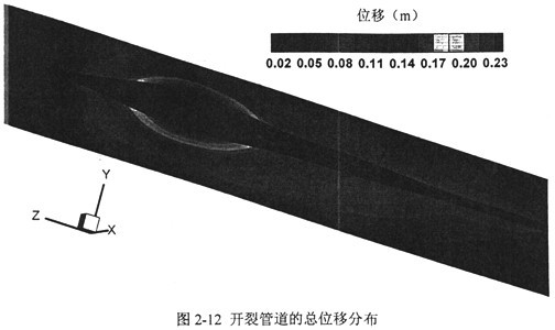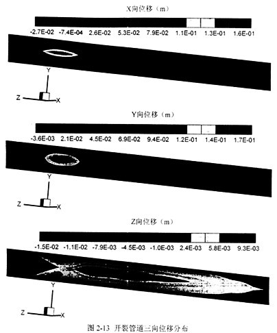 圖2-13分別按照三個(gè)方向上的位移分布在開(kāi)裂前管道表面畫(huà)出云紋圖。從圖中可以看到,此種設(shè)計(jì)參數(shù)下的位移量主要發(fā)生在裂尖附近5m左右的區(qū)域,對(duì)遠(yuǎn)端的影響較小。