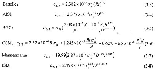 在雙曲線法的基礎(chǔ)上,結(jié)合大量的實驗結(jié)果對止裂韌性進(jìn)行標(biāo)定,世界各大研究機(jī)構(gòu)分別給出了簡便易算的經(jīng)驗公式用以估算臨界止裂韌性,列舉如下: