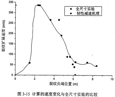 本文通過上述方法,對圖3-9至圖3-12中的全尺寸實測斷裂速度曲線結(jié)果進(jìn)行了校核,得到了比較吻合的結(jié)果。現(xiàn)以聯(lián)盟管道第一次實驗IE段為例,設(shè)定擴(kuò)展的初速度為330m/s,速度變化的計算值同實驗對比如圖3-15所示: