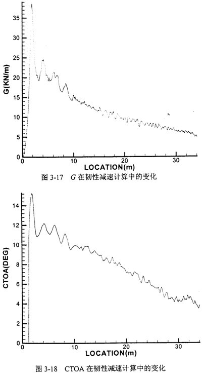 圖3-17和圖3-18是針對西氣東輸某特定設(shè)計參數(shù)的管線,應(yīng)用韌性減速機(jī)理計算時能量釋放率G和裂紋尖端張開角CTOA的變化。