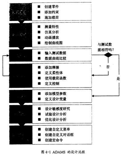在仿真中如果發(fā)現(xiàn)結(jié)果不對(duì),則我們需要對(duì)前面的模型進(jìn)行修正,然后再做仿真分析,直到結(jié)果正確。決而言之利用Pro/E和ADAMS進(jìn)行聯(lián)合仿真,其基本的步驟如圖4-5所示。