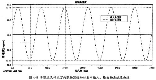 由圖4-9可以知道,當(dāng)輸入軸轉(zhuǎn)速恒定為90o/s時(shí),輸出軸并不作恒速轉(zhuǎn)動(dòng),而是以90o/s為中心,作非常有規(guī)律的周期性運(yùn)動(dòng),在每一個(gè)回轉(zhuǎn)周期中,它的變化頻率為3次。這里的結(jié)果同第三章中的曲線圖3-8也是完全吻合的,因此在一定的程度上也證明了三叉桿萬(wàn)向聯(lián)軸器轉(zhuǎn)速分析理論的正確性。