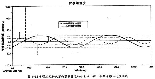 由圖4-13可以知道,在一定的夾角下,小桿在滑道中有滑移加速度同小桿球面中心相對(duì)軸頸的滑移加速度是不同的,前者要大于后者,且它們變動(dòng)的頻率也不一樣,在一個(gè)回轉(zhuǎn)周期中前頻率是1次,而后者2次。此圖中的兩曲線同第三章中的理論分析曲線圖3-13、圖3-14是吻合的,只是小桿滑移的加速度曲線在外形上有差異,仿真的曲線相當(dāng)?shù)钠交、?guī)則,但理論分析曲線卻不規(guī)則,這可能是在計(jì)算中簡(jiǎn)化和省略的原因。盡管如下,這在一定的程度上也證明了三叉桿式萬(wàn)向聯(lián)軸器理論分析中對(duì)小桿滑移加速度和軸頸滑移加速度這兩項(xiàng)計(jì)算的正確性。(值得說(shuō)明的是此圖中曲線有時(shí)有突變的現(xiàn)象,主要是考慮到計(jì)算機(jī)的性能,計(jì)算中步長(zhǎng)稍大的原故。在后面的分析曲線中也出現(xiàn)了這樣的情況,將不再作說(shuō)明。)