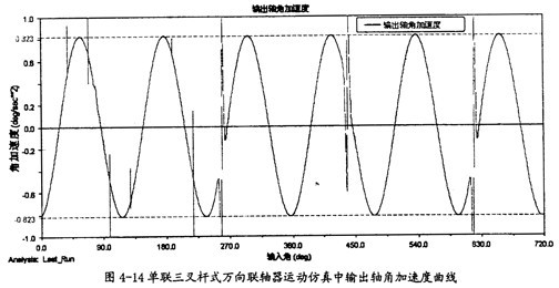 由圖4-21可以看出,雙聯(lián)三叉桿式萬(wàn)向聯(lián)軸器同單聯(lián)三叉桿式萬(wàn)向聯(lián)軸器的輸出曲線相似,當(dāng)輸入軸轉(zhuǎn)速恒定時(shí),輸出軸轉(zhuǎn)速呈現(xiàn)有規(guī)律的波動(dòng),在每一個(gè)回轉(zhuǎn)周期中,它的變化頻率為3次,同圖3-8中的β=10°時(shí)的曲線相比,雙聯(lián)同單聯(lián)的情況差不多,故三叉桿式萬(wàn)向聯(lián)軸器在雙聯(lián)的結(jié)構(gòu)形式下輸出轉(zhuǎn)速特性直觀上無(wú)改善。