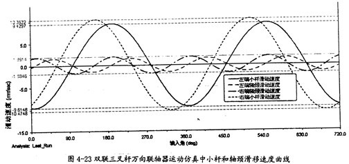 由圖4-23可以看出,雙聯(lián)三叉桿式萬(wàn)向聯(lián)軸器在運(yùn)轉(zhuǎn)的過(guò)程中,左右兩端的小桿滑移速度幾乎相等,左右兩端軸頸的滑移速度也接近等值,且軸頸的滑移速度比小桿沿滑道滑移速度要小得多,它們的變化頻率同單聯(lián)時(shí)的情況相比也無(wú)變化,在大小上同β=10°的單聯(lián)三叉桿式萬(wàn)向聯(lián)軸器的特性是相同的。
