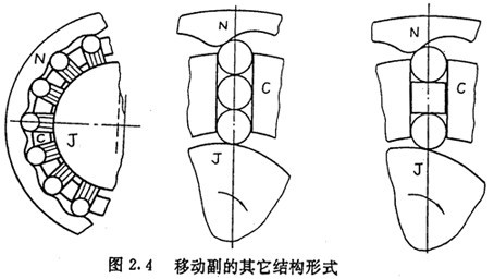 圖2.4所示是推桿與導(dǎo)槽所構(gòu)成的移動(dòng)副的另外幾種形式,它們也未能很好地解決移動(dòng)副所帶來的滑動(dòng)摩擦問題。